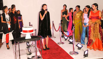 August 13th 2012, New York, NY: Emerging designer Siddhi Vaishnav debuted her first collection at 27th Street Studio in Manhattan. Luxurious fabrics such as raw silk, georgette and chiffon mingled with rhinestone, fabric appliques and thread embroideries in the colors of mustards, blues, blacks and bold whites and reds. Cuts included shorter hemline lehngas, stitched sarees, capes over leggings, dresses and gowns. The collection, named A Tale of Two Cities, was influenced by the cities of New York and Mumbai. The label carries the tagline “because life is a red carpet™,” and the show was set on none other than… a red carpet.