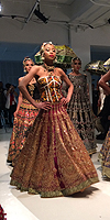 Perhaps the most anticipated of the collection was Ali Xeeshan whose digital printed lehngas bursting with clashing colors have placed this designer amongst the elite of Pakistan. Also seen was RTW designer Maria B. Notable shows where gowns by Nickie Nina and New Jersey-based fashion house NzK Designer’s Studio. Braahtii showed interesting digital prints of old Bollywood heroines and maharanis emblazoned on the back of otherwise subdued tunics. Rawaj By Pinx colored the collections with their kundan and stone jewelry while Hamna Amir Designer Jewelry continued the trend with handbags made entirely of gold metal and stones.
