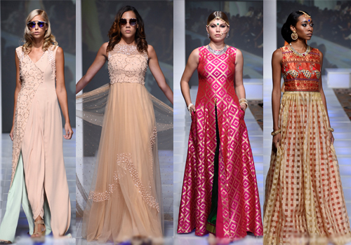Sachin and Babi: Bridal favorite Sachin and Babi used their skills with sequins, silk, and pearls to wow the crowd. The whimsical looks and detailed pieces lent to the theme of rebirth for the collection. Many of the pieces show movement and are impeccably tailored.