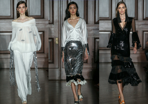 Romance guided the collection as Khan was inspired by dancer Anna Pavlova. The models all wore floral crowns and silk ballet-slipper ribbons which was a nodded to Pavlova, and silver face jewelry, which spoke to Khan’s Indian roots.