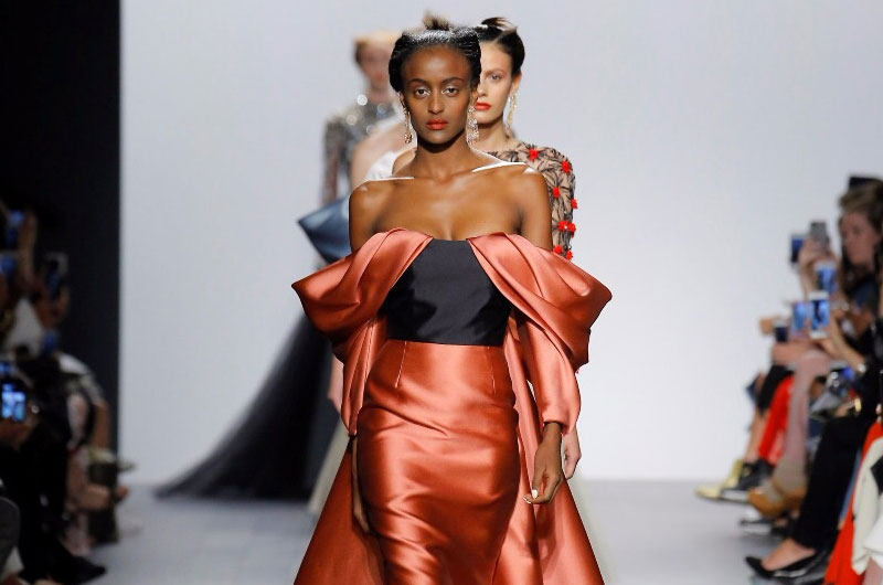 Looking to break the mold designer Mac Duggal used the influencers of fashion during his runway show. The collection centered around body positivity and diversity as models of different sizes and colors wore the collection. Duggal used 3-D printing lace alongside handwork embroidery to showcase his design skills.