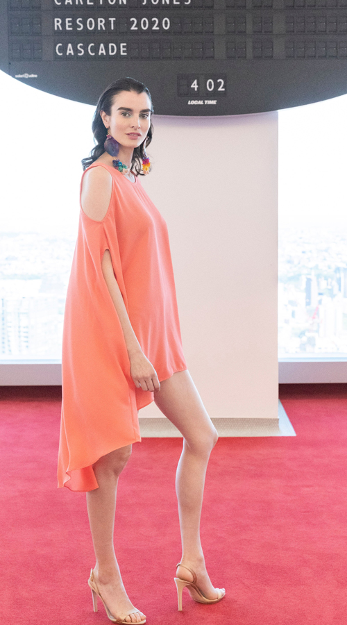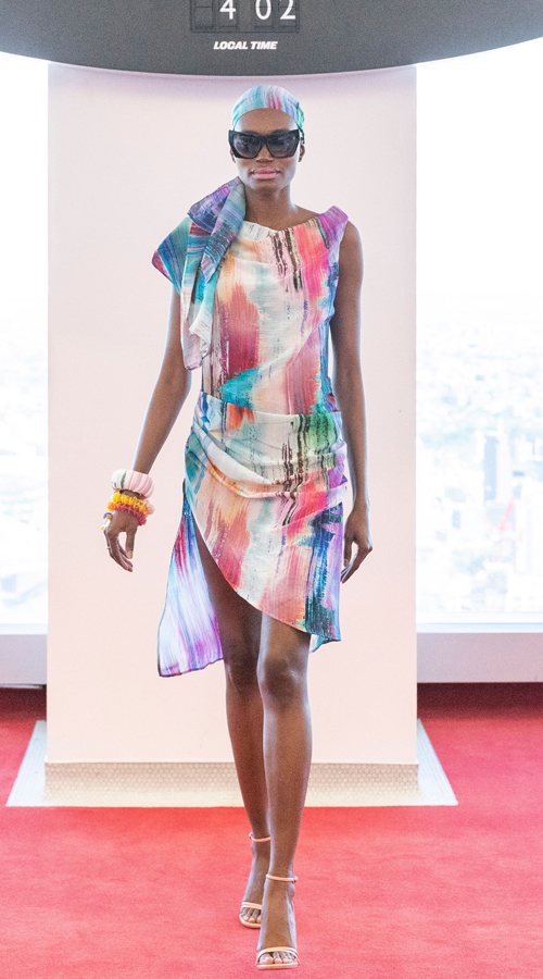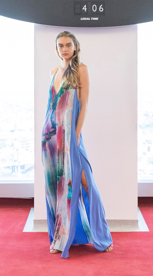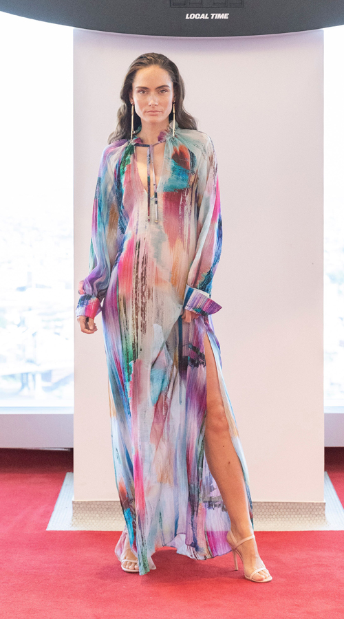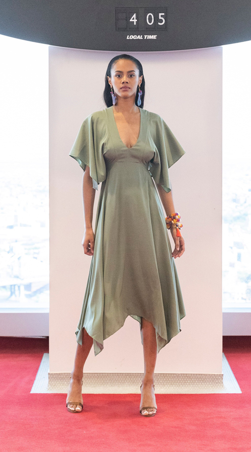 Other notables include the premium fit of the kimono sleeve Rose dress, and it’s zig-zag hemline, the asymmetry in the incredibly forgiving ruched dress, which was shown in silk print, and then punctuated with a version in tencel jersey which celebrates and support curves, as shown on Liris. Closing the show was the breathtaking finale tunic with head-to-toe voluminous flow in the season’s signature print.